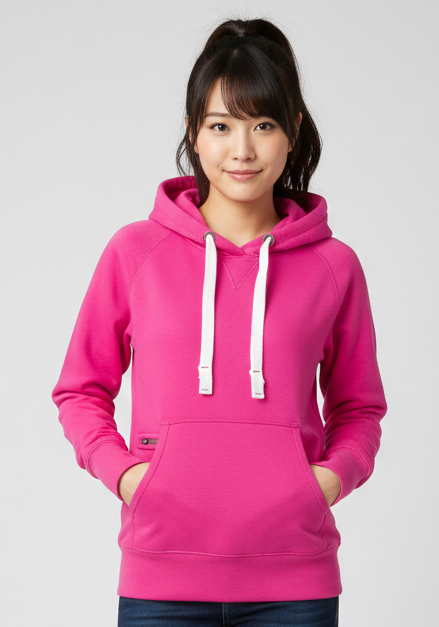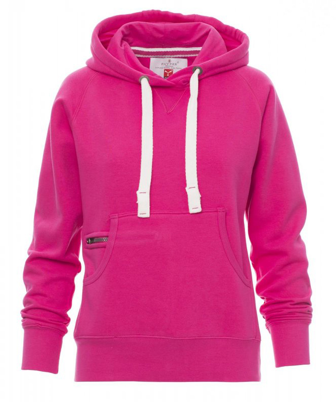 Felpa sfiancata da donna, cappuccio a due cuciture, coulisse bianca in corda con cuciture in tinta con la felpa e anelle in metallo, manica raglan, cucitura estetica a V al collo, tasche a marsupio, taschino con zip, polsini e vita in costina elasticizzata, cuciture rinforzate.