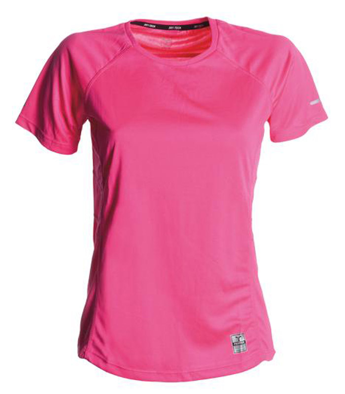 T-shirt tecnica-sportiva sfiancata da donna con manica raglan, doppia cucitura laterale per una migliore vestibilità, fondo sagomato e più lungo sul retro, inserto riflettente alle maniche e retro collo, nastratura del collo a contrasto, etichetta transfer.