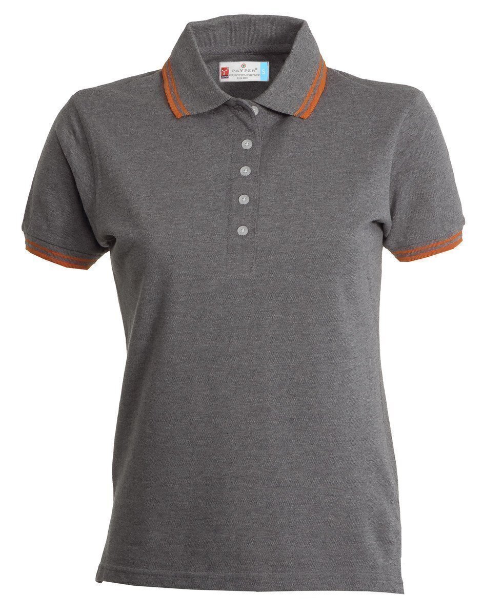 Polo donna sfiancata a manica corta a cinque bottoni bianchi, collo e bordo manica con fine profilo a contrasto, bordo manica a costine, spacchetti laterali, cuciture del collo coperte, nastro di rinforzo laterale.
